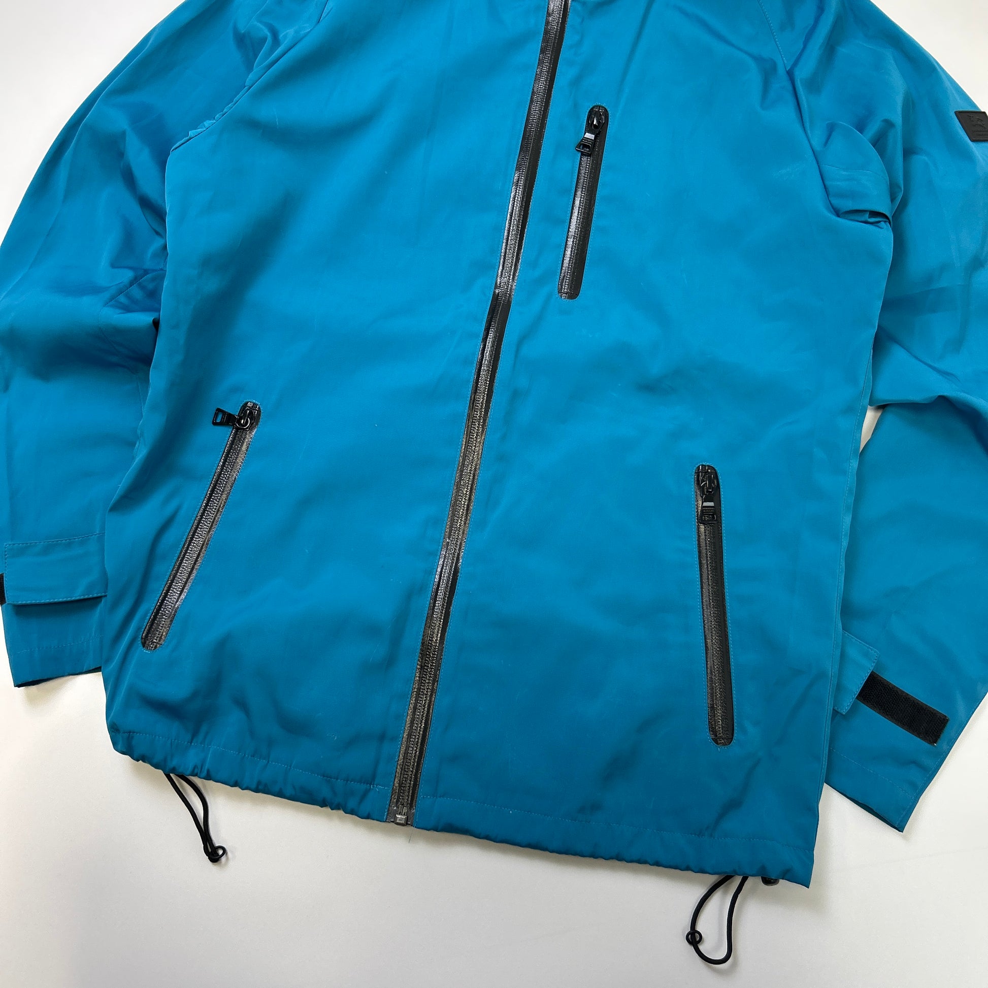 Black label technical jacket, rubber label patch, packable hood
