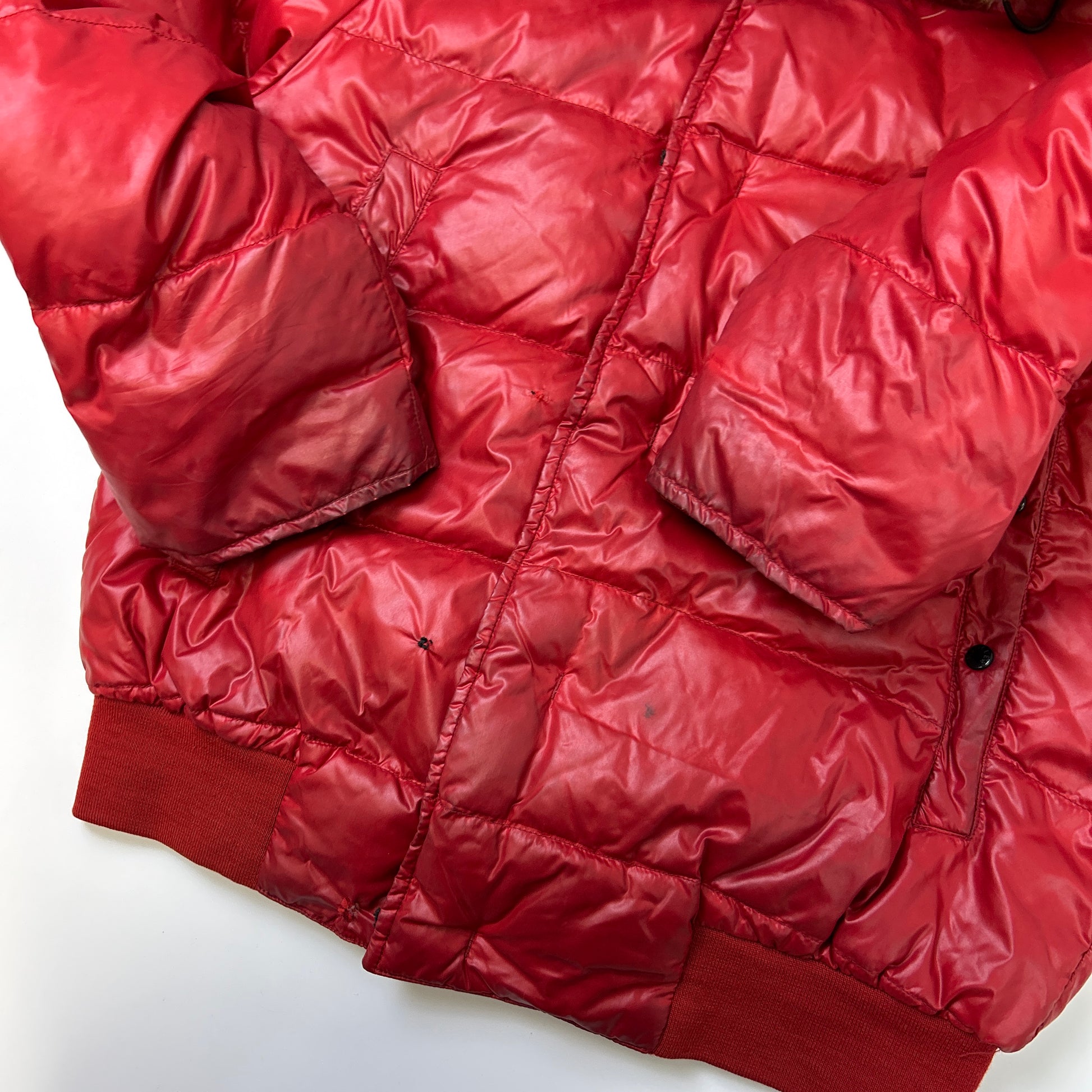 Red glossy goose down fur hooded jacket